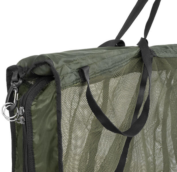 A Delphin CLASSA CWS egy praktikus eszköz, amely alkalmas a halak biztonságos és kíméletes lemérésére vagy rövid távú tárolására. Mint a CLASSA sorozat minden terméke, ezt a mérlegelőtáskát is magas színvonalú kivitelezés, funkcionalitás és nagyon elérhető ár jellemzi. A táska pántjai teljes hosszukban úszókkal vannak ellátva, ami lehetővé teszi a fogás biztonságos vízben való tárolását, például a fotózásra való felkészülés során. A fő rész finom hálóból készült, amely rendkívül kíméletes a halakhoz. A felhasznált anyag lehetővé teszi az összes víz elvezetését a hal felemelése és kezelése során, ez pedig pontos mérlegelést eredményez. A hálót két fekete textilpánt erősíti meg, amelyek központi fogantyúvá alakulnak át. A hosszú füleknek köszönhetően a táska könnyen mérlegre akasztható. A táska mindkét oldalán textil fogantyúval rendelkezik a könnyű emelés és szállítás érdekében. Erős cipzár található mindkét oldalon és a tetején, így a CWS teljesen kicipzározható a halak könnyebb kezelése érdekében. Egy 3 m hosszú, menetes csatlakozással rendelkező rögzítőzsinór is jár hozzá. Ez a rendszer biztosítja a mérlegelőzsák biztonságos rögzítését a parton. A zsinór a táska oldalán egy integrált, kompakt tasakban található. Ezenkívül egy csatt is található az oldalán a cipzár rögzítésére, amely megakadályozza a táska véletlenszerű kinyílását és a hal kiszabadulását.  Műszaki adatok:Méretek: 100x50x8 cm