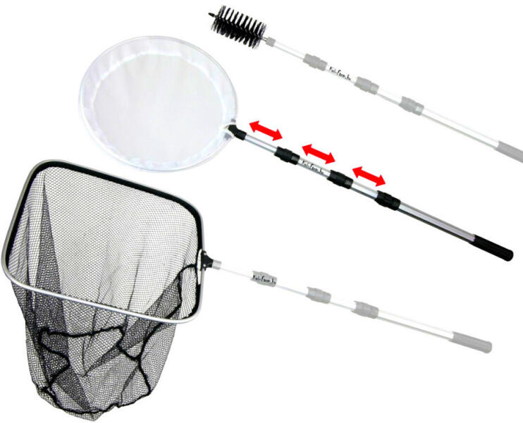 Több funkciós leszállóháló mely 3-szoros meghosszabíthatósággal rendelkezik. Cserélhető fejekkel. Könnyű teleszkópos alumínium fogantyúval. hossza: 0,58-1,80 m, Négyzet alakú háló: 40x40 cm, mélység 50 cmfinom szemű kerek háló: 35 cm, Mélység :12 cmEcsetfej: 7cmx12 cm hosszúfogantyú hossza: 58?180 cm